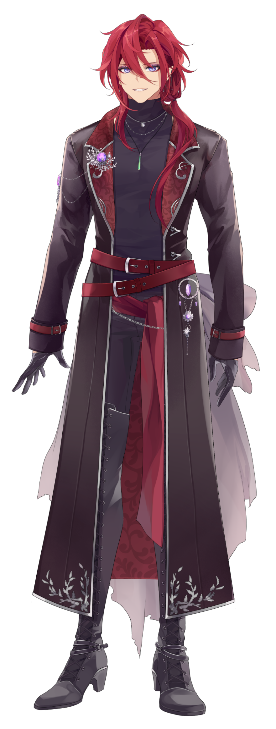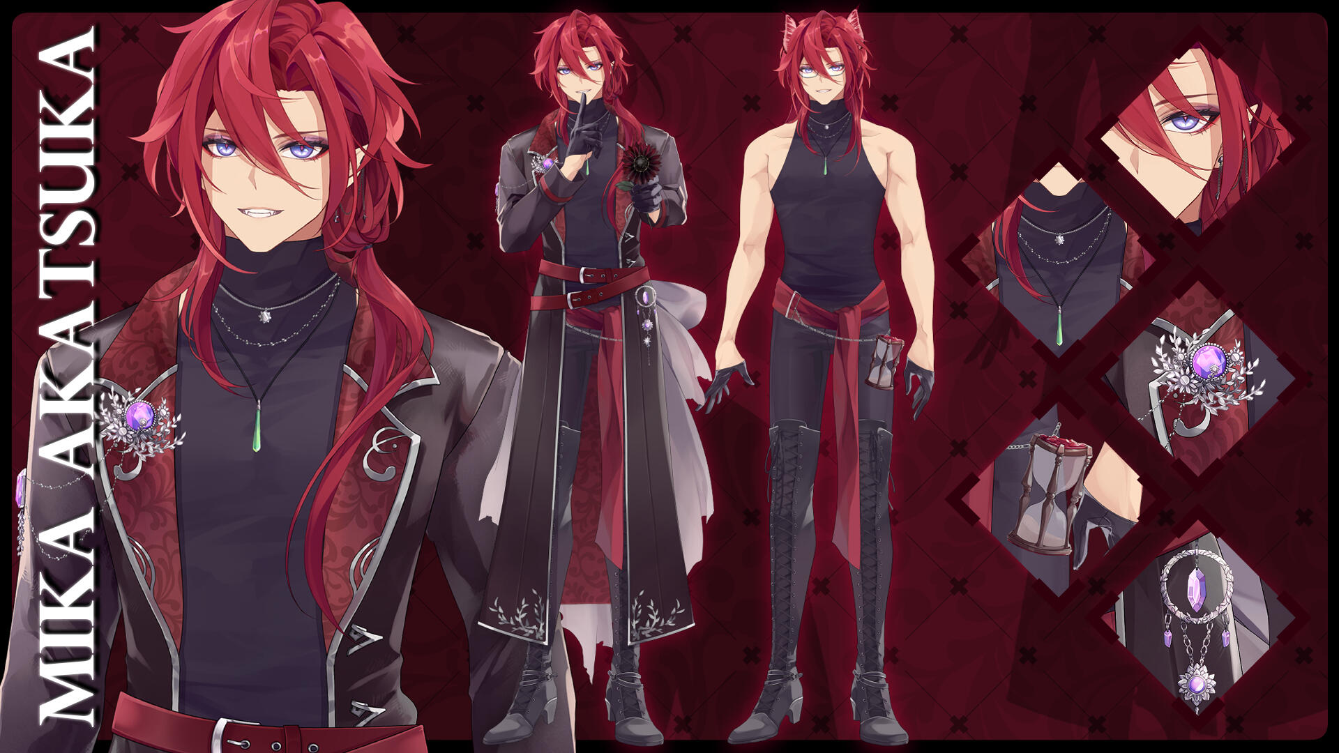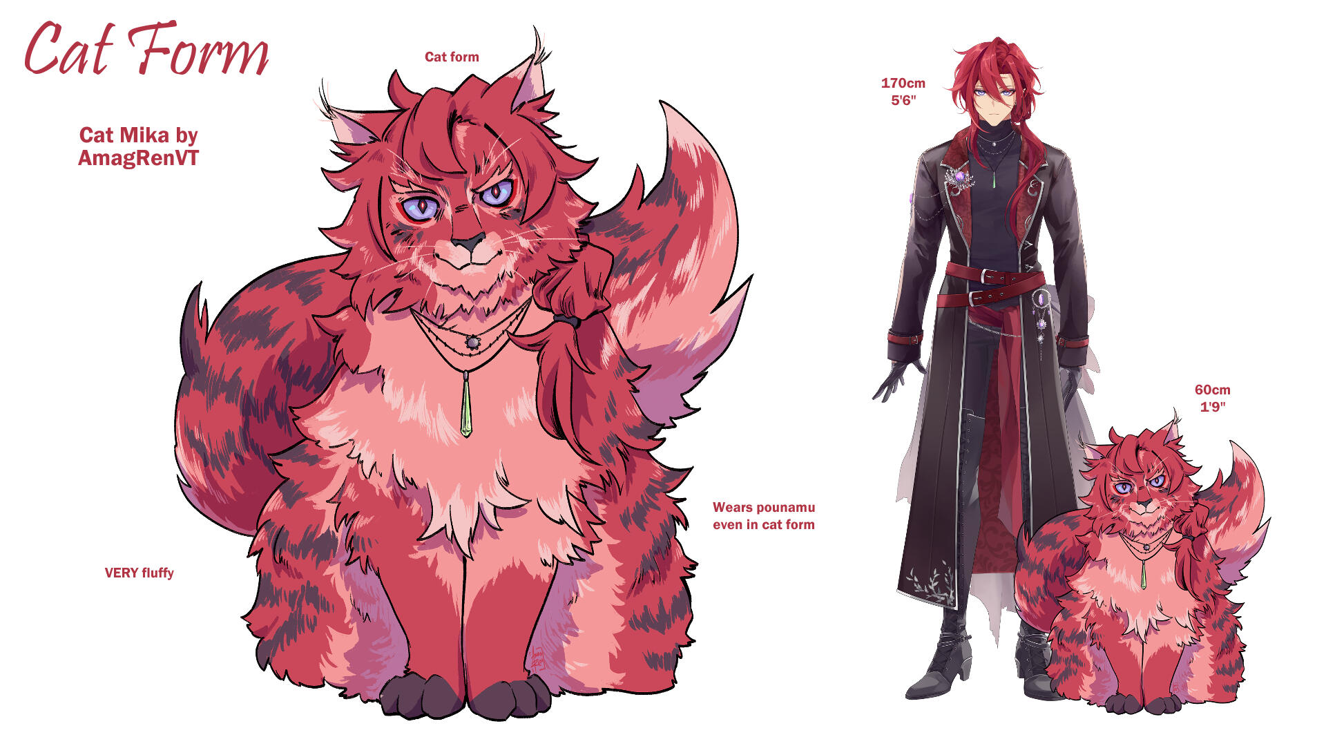 A being from another world, closely aligned to depictions of patupaiarehe however uses *vampire as a quick descriptor.In human form, Mika Akatsuka is a red-haired man with pointed ears and fangs. He has messy bangs and a long ponytail that rests over his left shoulder. He wears a sleeveless black turtle-neck muscle shirt under a soft leather jacket with patterned red fabric on the lapels and inner jacket. The jacket also features silver filigree for details. He wears black pants and thigh-high heeled boots with laces and silver details. On his hands he wears black leather half-palm gloves.Around his waist he wears a red sash with an hourglass chained to it. The hourglass is magical however it appears whatever abilities it had were lost upon arriving in this world. He also wears red belts around the outside of his jacket. At the small of his back, wrapped around the belts, is a grey gauze material.For accessories, he wears a collection of floral themed necklaces as well as a pounamu necklace, carved from greenstone with protection magic imbued into it. The shape is based on toki-adze which is a symbol of strength, determination, and courage in times of adversity. His left ear has a helix-to-lobe chain earring with a moon and star.He also has a set of jewellery involving purple gemstones. A brooch, surrounded by silver sunflower filigree which is connected to a gem on his shoulder and a hanging pendant made from a broken gemstone surrounded by more silver filigree.His clothing and makeup is inspired by visual kei.In cat form, he is akin to a large, very fluffy red Maine Forest cat at 60cm (1'9"). He still retains his pounamu in this form.