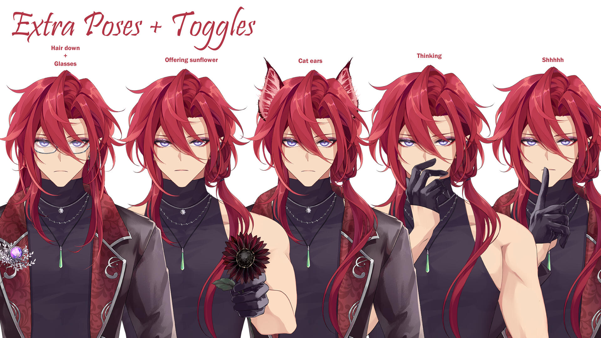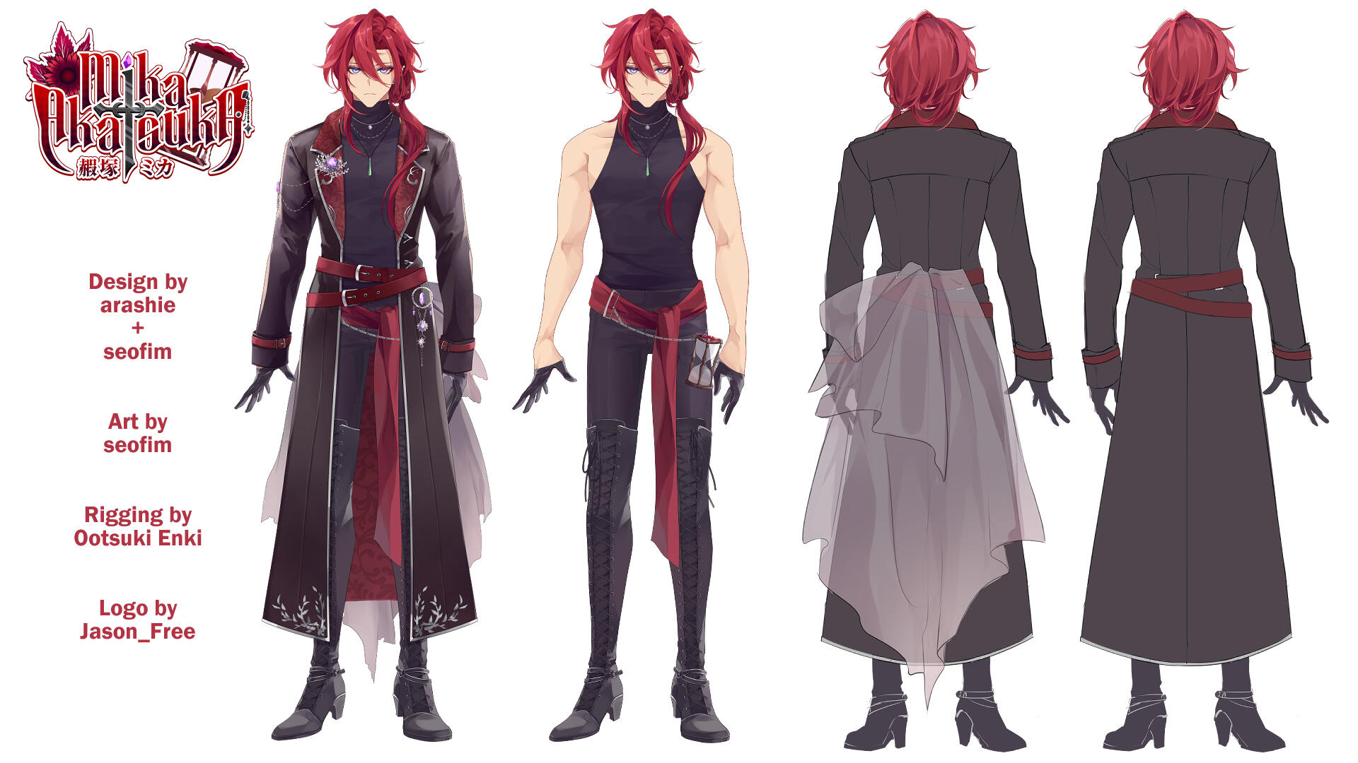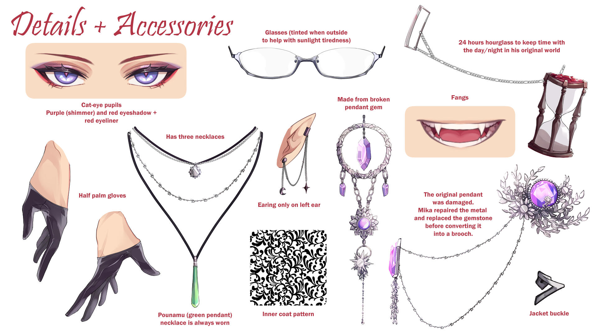 A being from another world, closely aligned to depictions of patupaiarehe however uses *vampire as a quick descriptor.In human form, Mika Akatsuka is a red-haired man with pointed ears and fangs. He has messy bangs and a long ponytail that rests over his left shoulder. He wears a sleeveless black turtle-neck muscle shirt under a soft leather jacket with patterned red fabric on the lapels and inner jacket. The jacket also features silver filigree for details. He wears black pants and thigh-high heeled boots with laces and silver details. On his hands he wears black leather half-palm gloves.Around his waist he wears a red sash with an hourglass chained to it. The hourglass is magical however it appears whatever abilities it had were lost upon arriving in this world. He also wears red belts around the outside of his jacket. At the small of his back, wrapped around the belts, is a grey gauze material.For accessories, he wears a collection of floral themed necklaces as well as a pounamu necklace, carved from greenstone with protection magic imbued into it. The shape is based on toki-adze which is a symbol of strength, determination, and courage in times of adversity. His left ear has a helix-to-lobe chain earring with a moon and star.He also has a set of jewellery involving purple gemstones. A brooch, surrounded by silver sunflower filigree which is connected to a gem on his shoulder and a hanging pendant made from a broken gemstone surrounded by more silver filigree.His clothing and makeup is inspired by visual kei.In cat form, he is akin to a large, very fluffy red Maine Forest cat at 60cm (1'9"). He still retains his pounamu in this form.