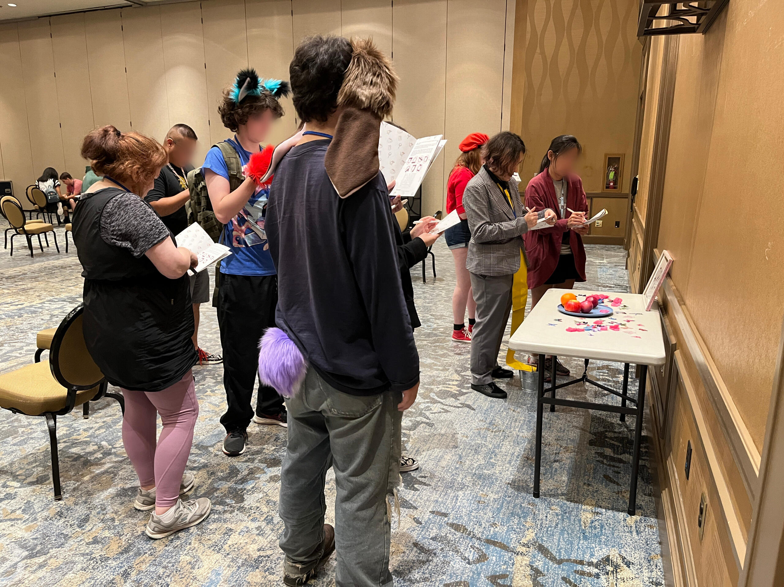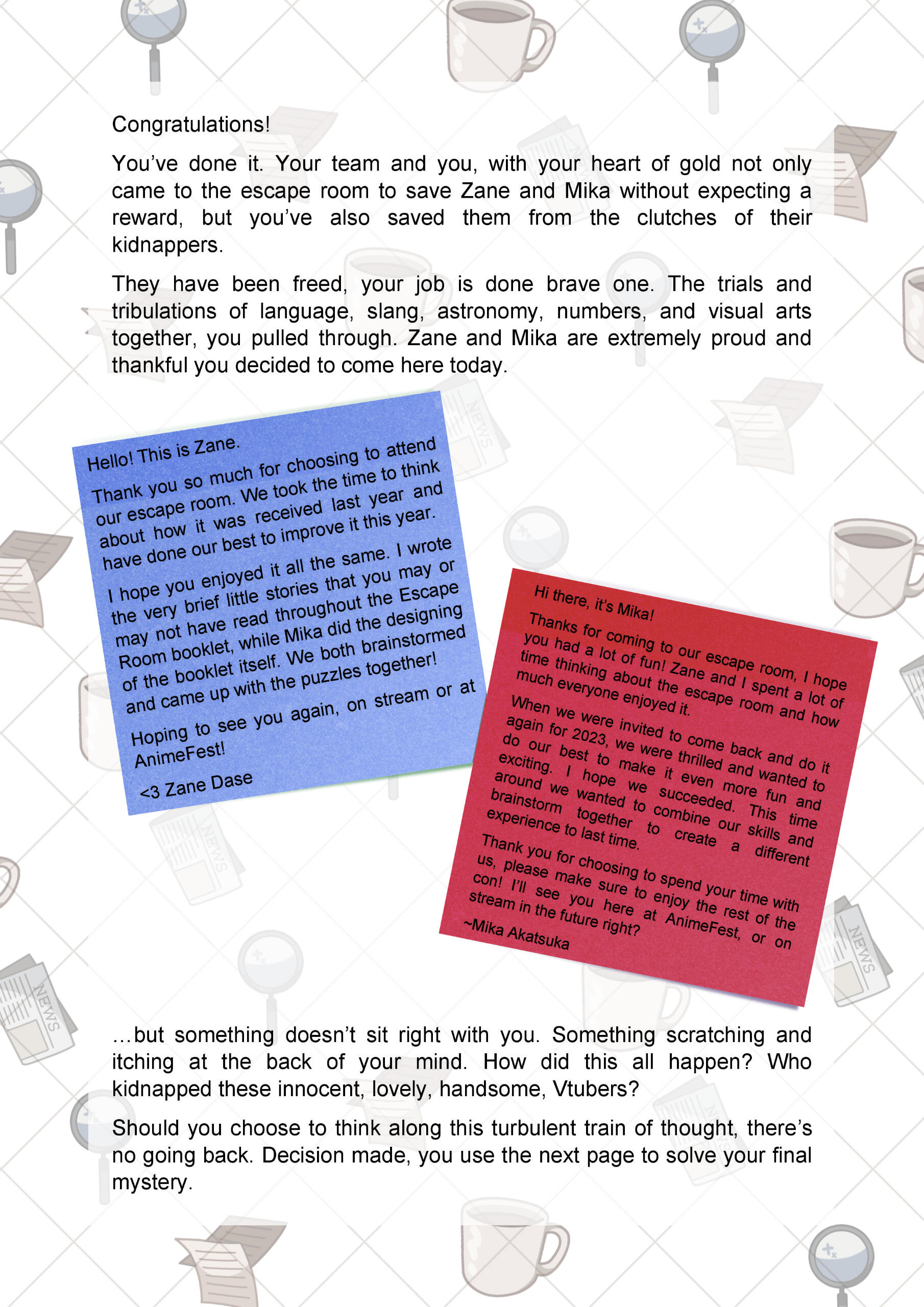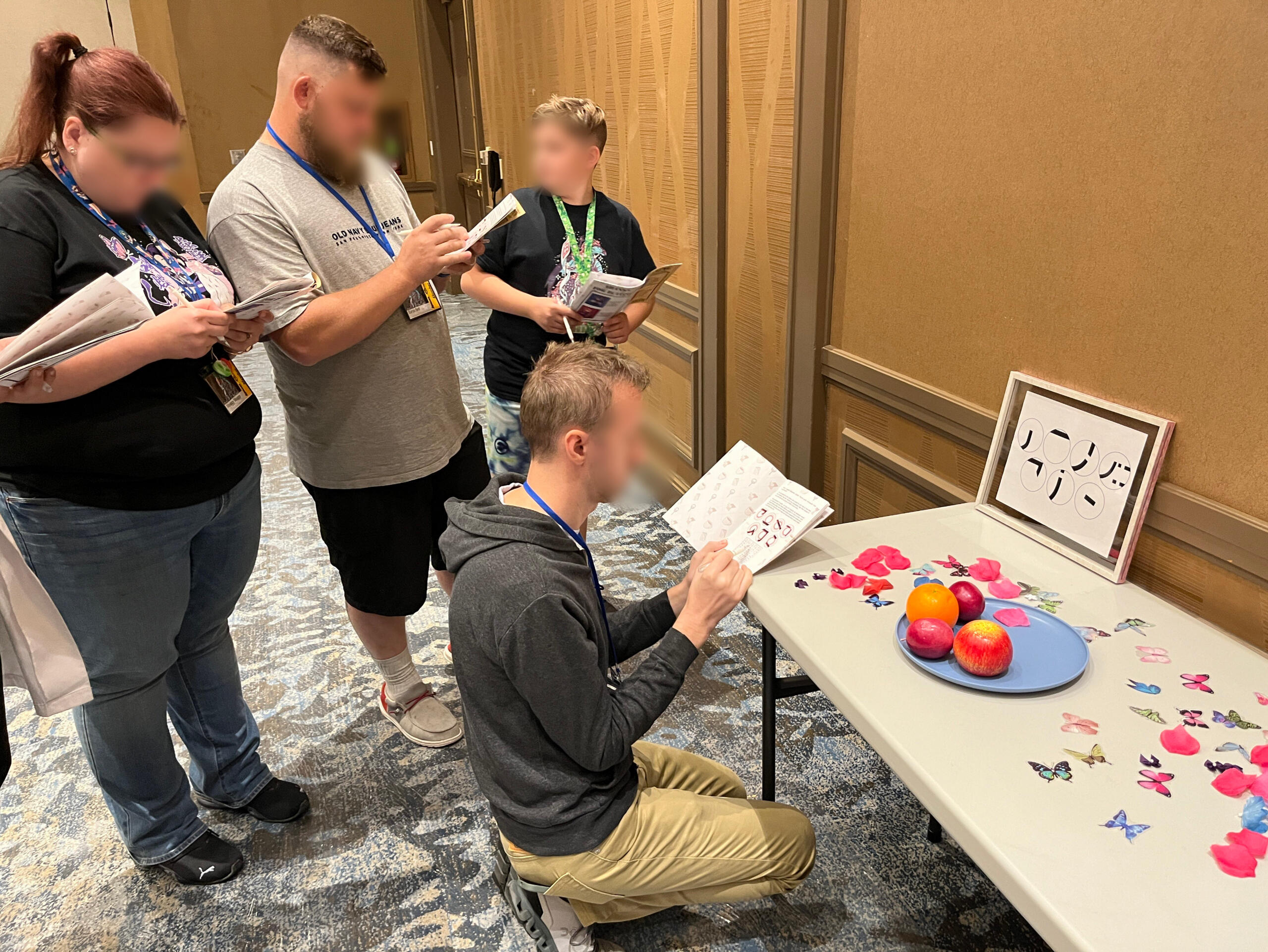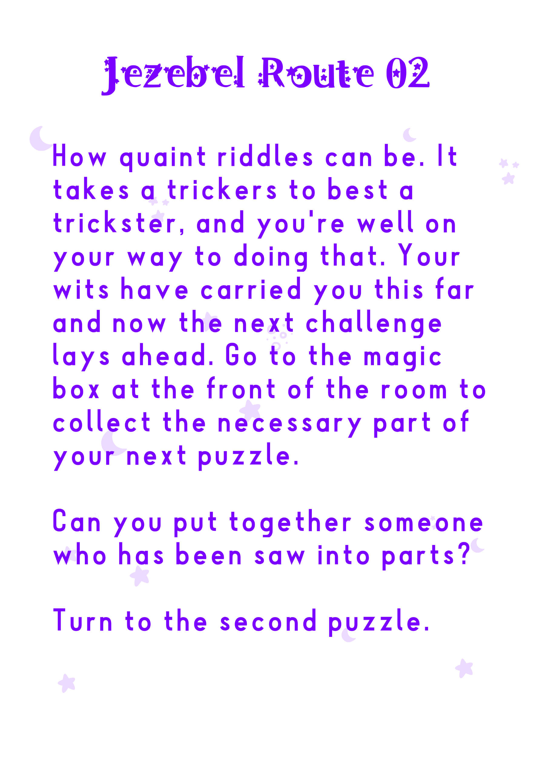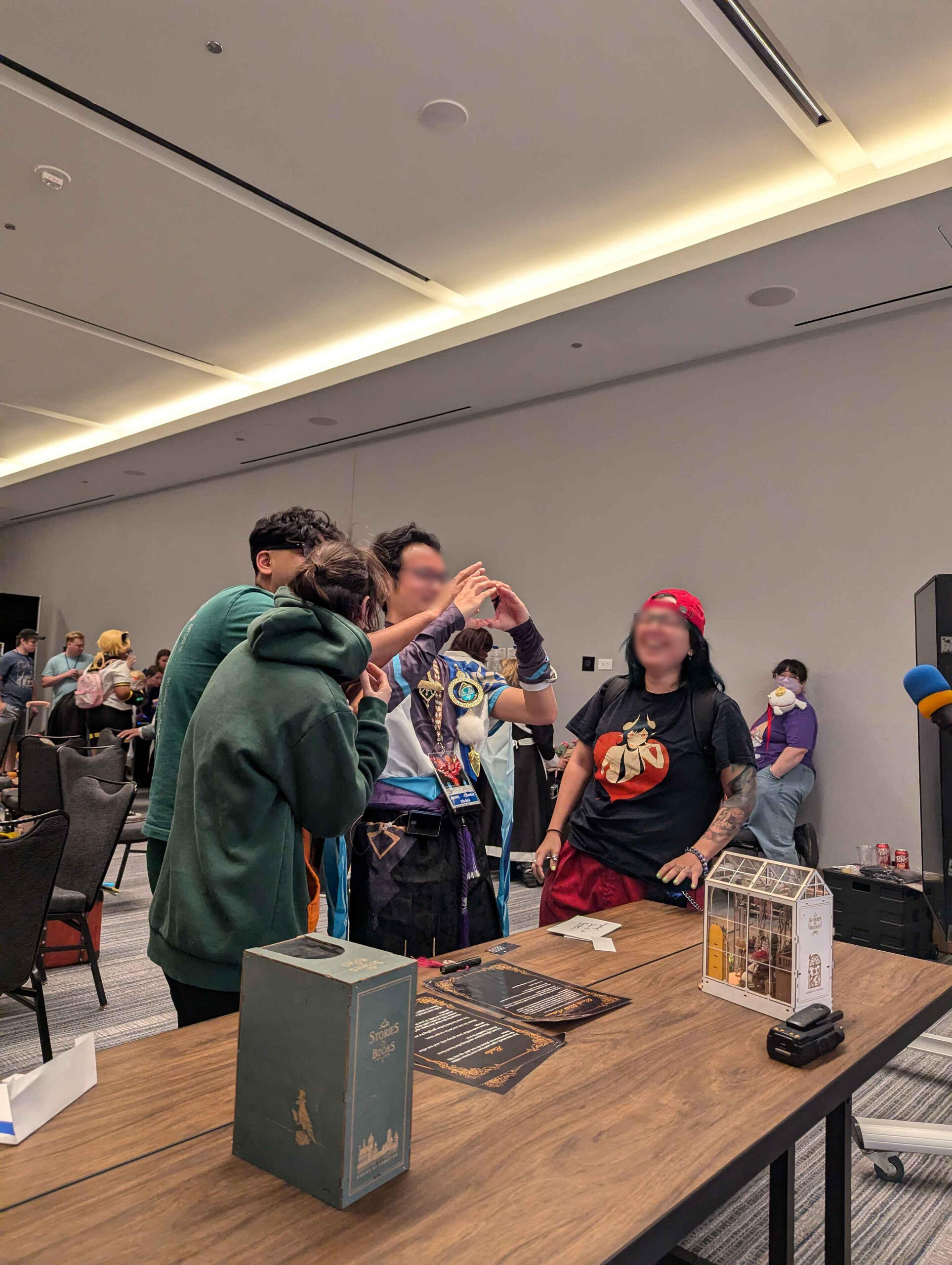 This was the first year we were able to try this concept, originally from an idea pitched in 2021. It consisted of mostly paper-based puzzle solving from a booklet.There was two "routes" themed the attendees being captured by each VTuber. Zane's puzzles were literature related, and mine were stage magician related (previous theme before rebrand).