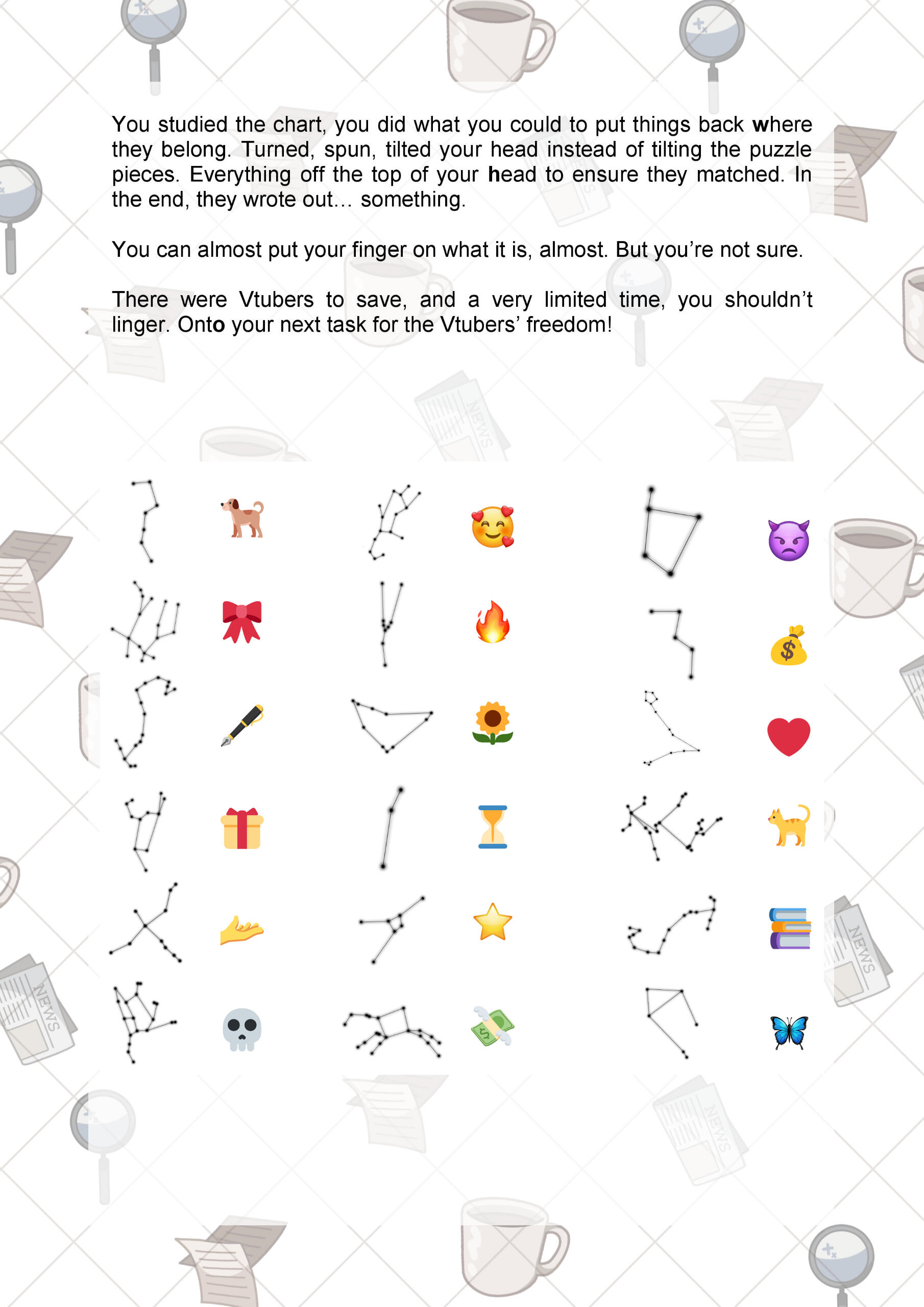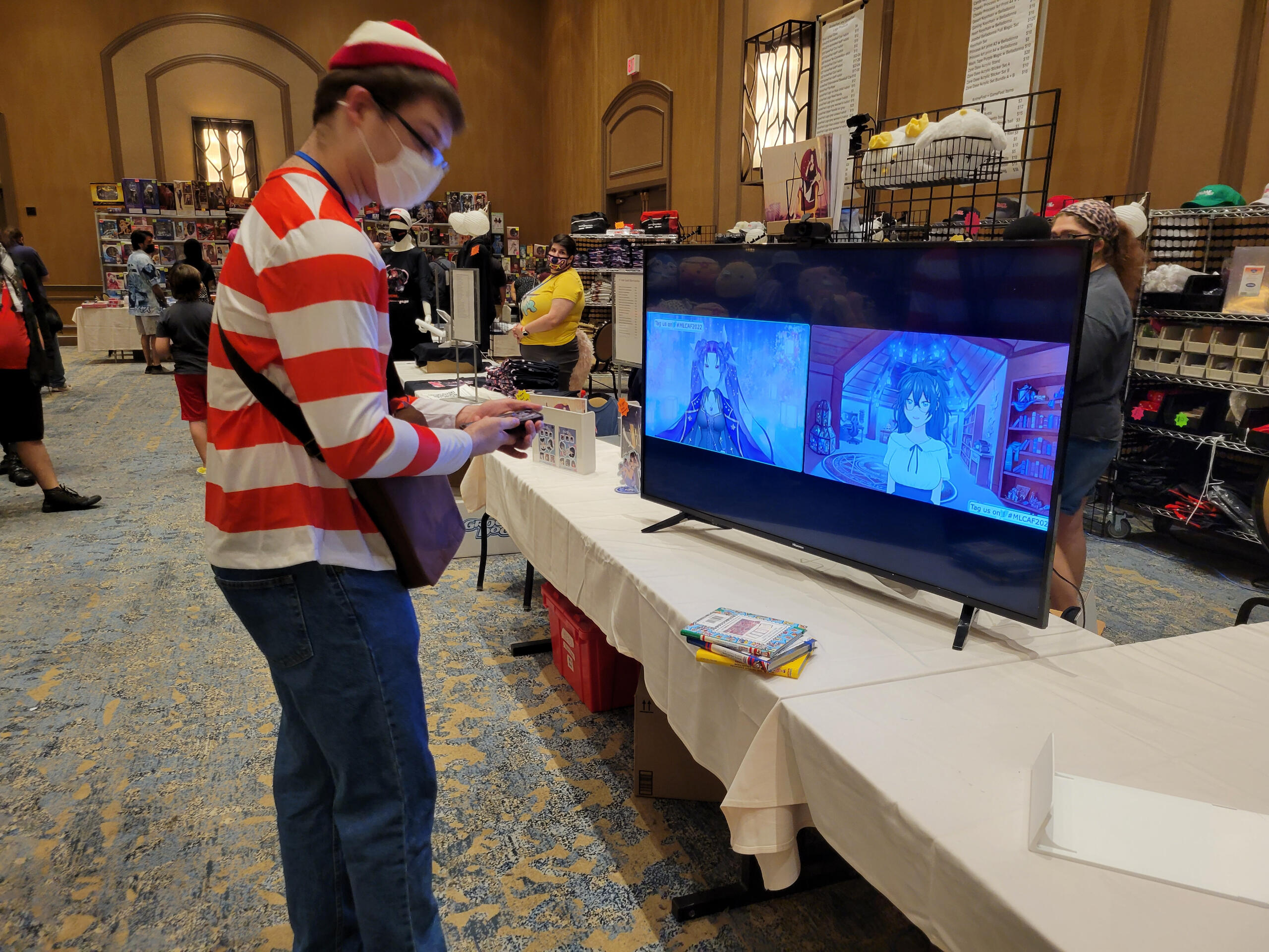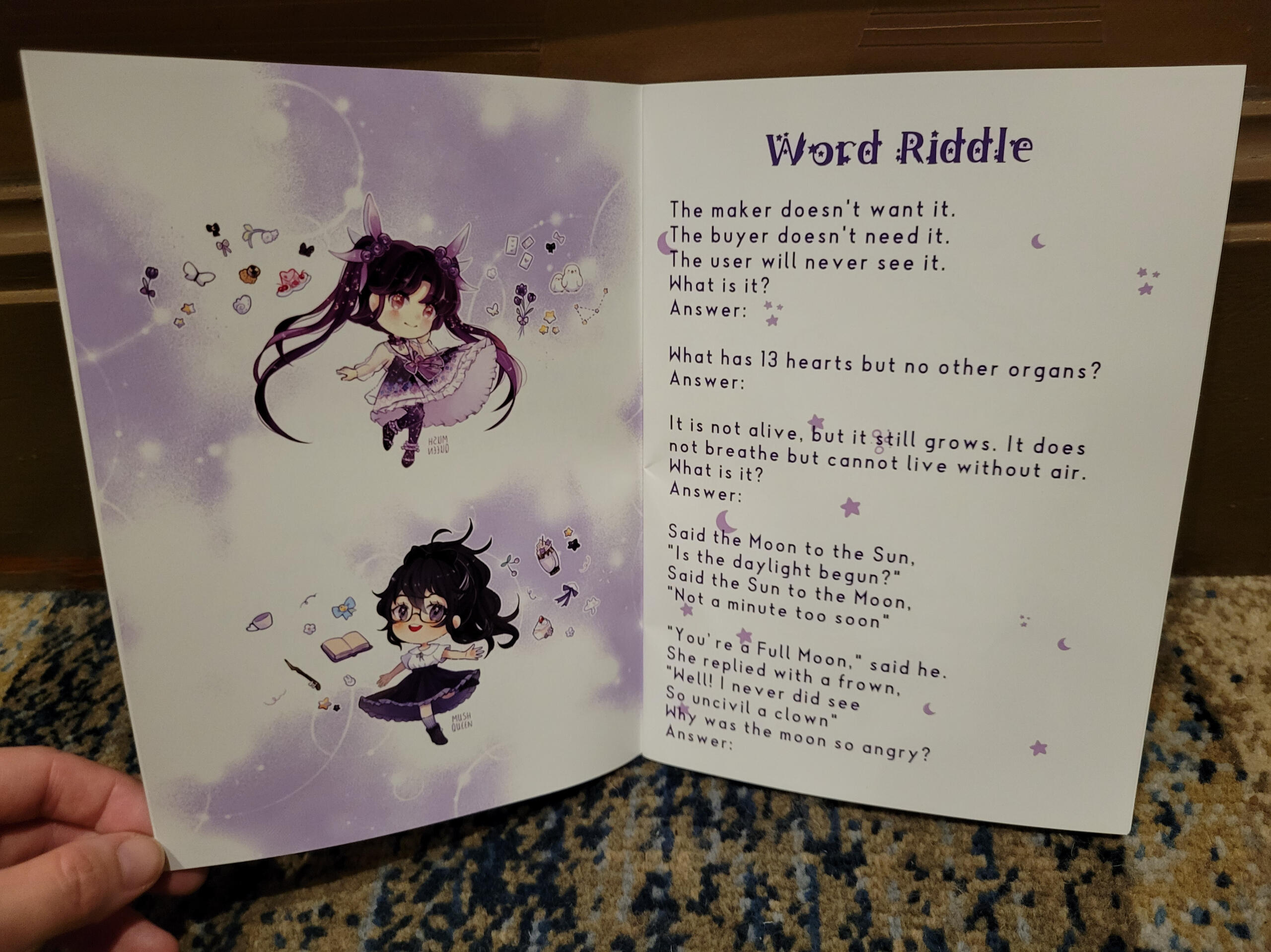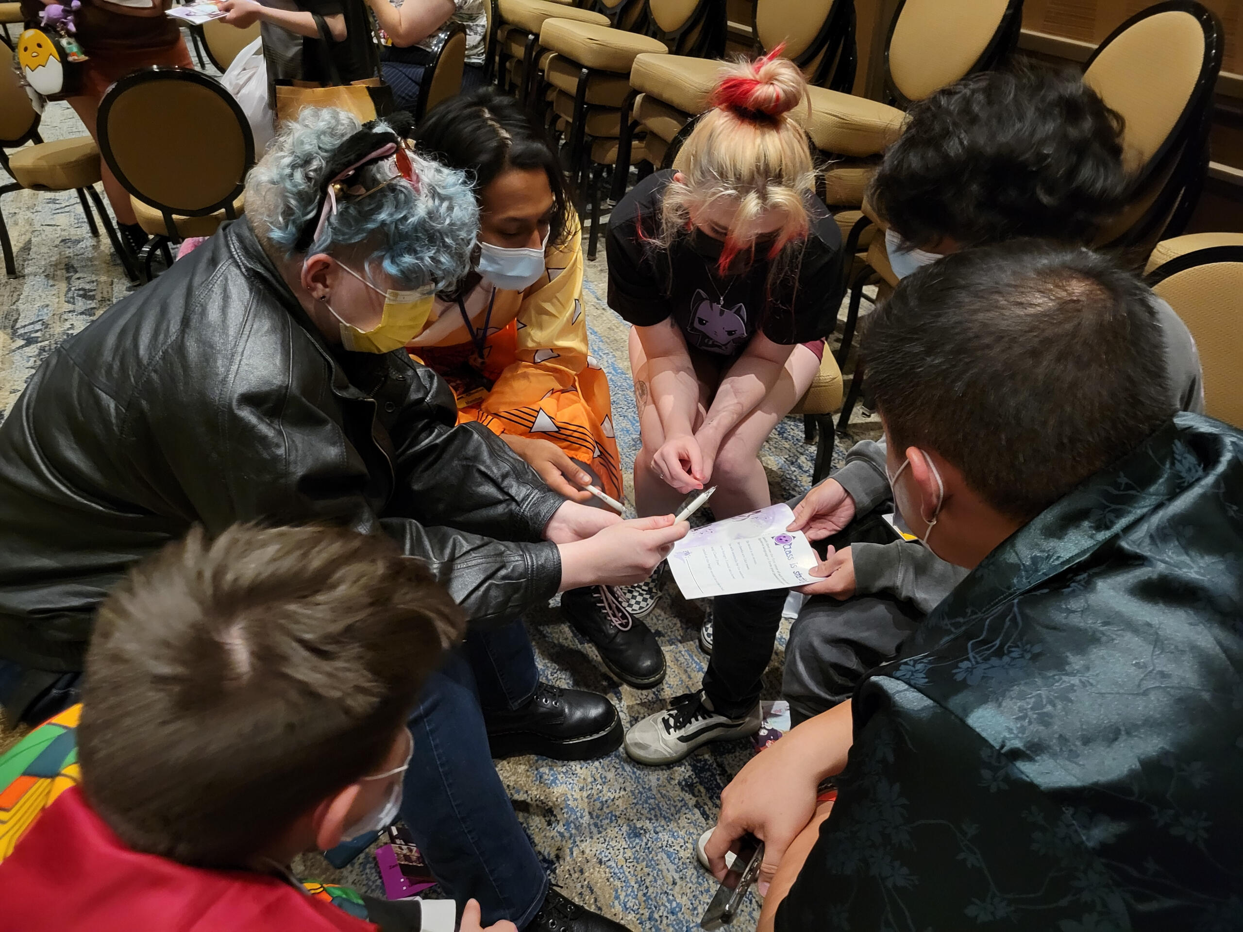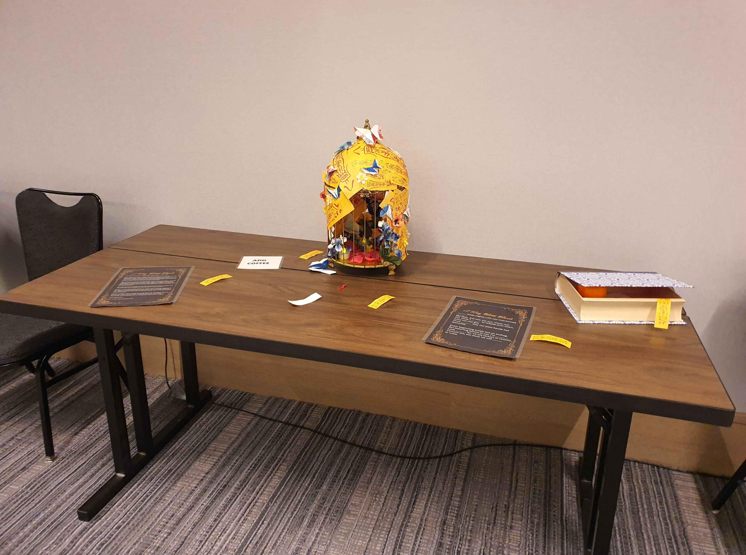 This was the first year we were able to try this concept, originally from an idea pitched in 2021. It consisted of mostly paper-based puzzle solving from a booklet.There was two "routes" themed the attendees being captured by each VTuber. Zane's puzzles were literature related, and mine were stage magician related (previous theme before rebrand).