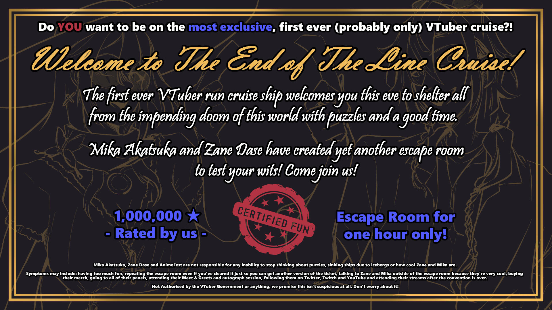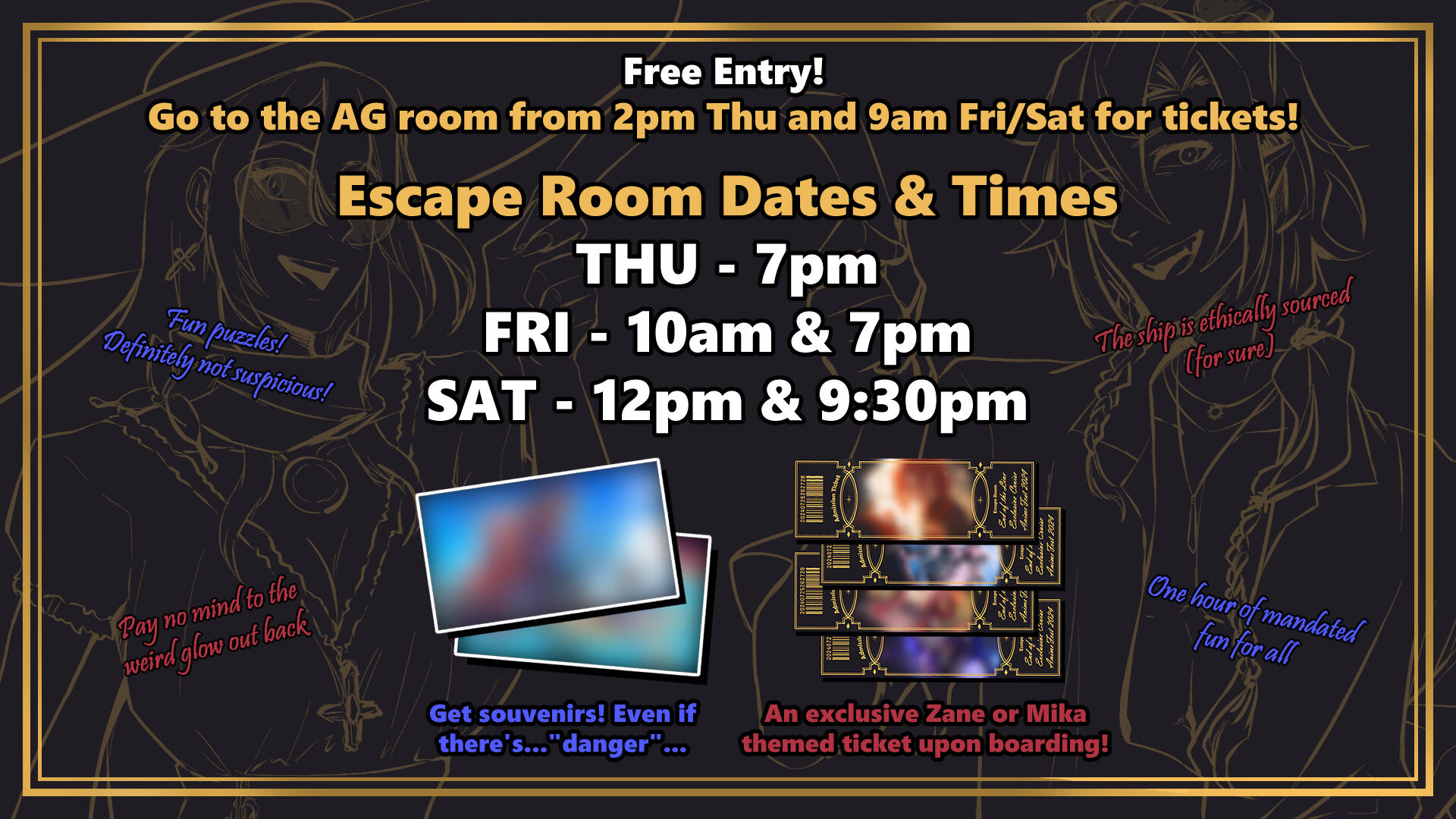 2024 was the last year for AnimeFest as a convention, so we went all out to make a memorable experience. The theme revolved around a cruise hosted by us that had mishaps left and right and everyone was required to solve puzzles to send for help and escape the quickly sinking ship.I was also able to design special "ads" for the convention's social media to advertise the escape rooms.