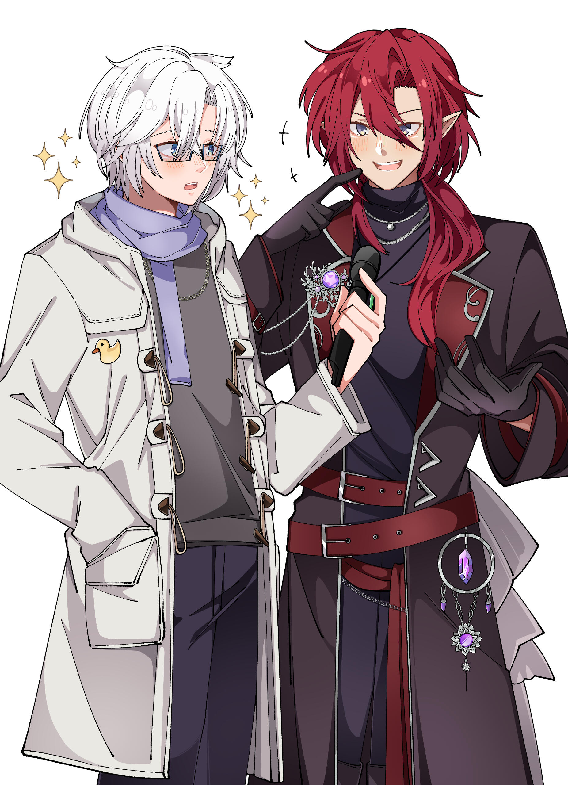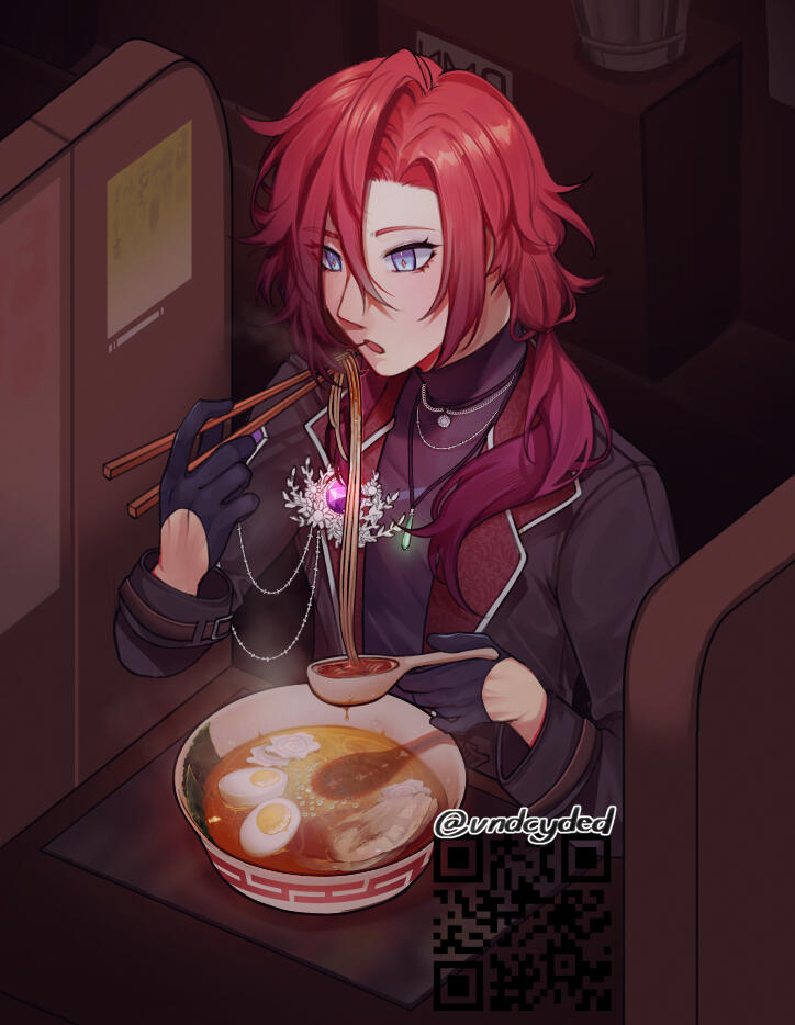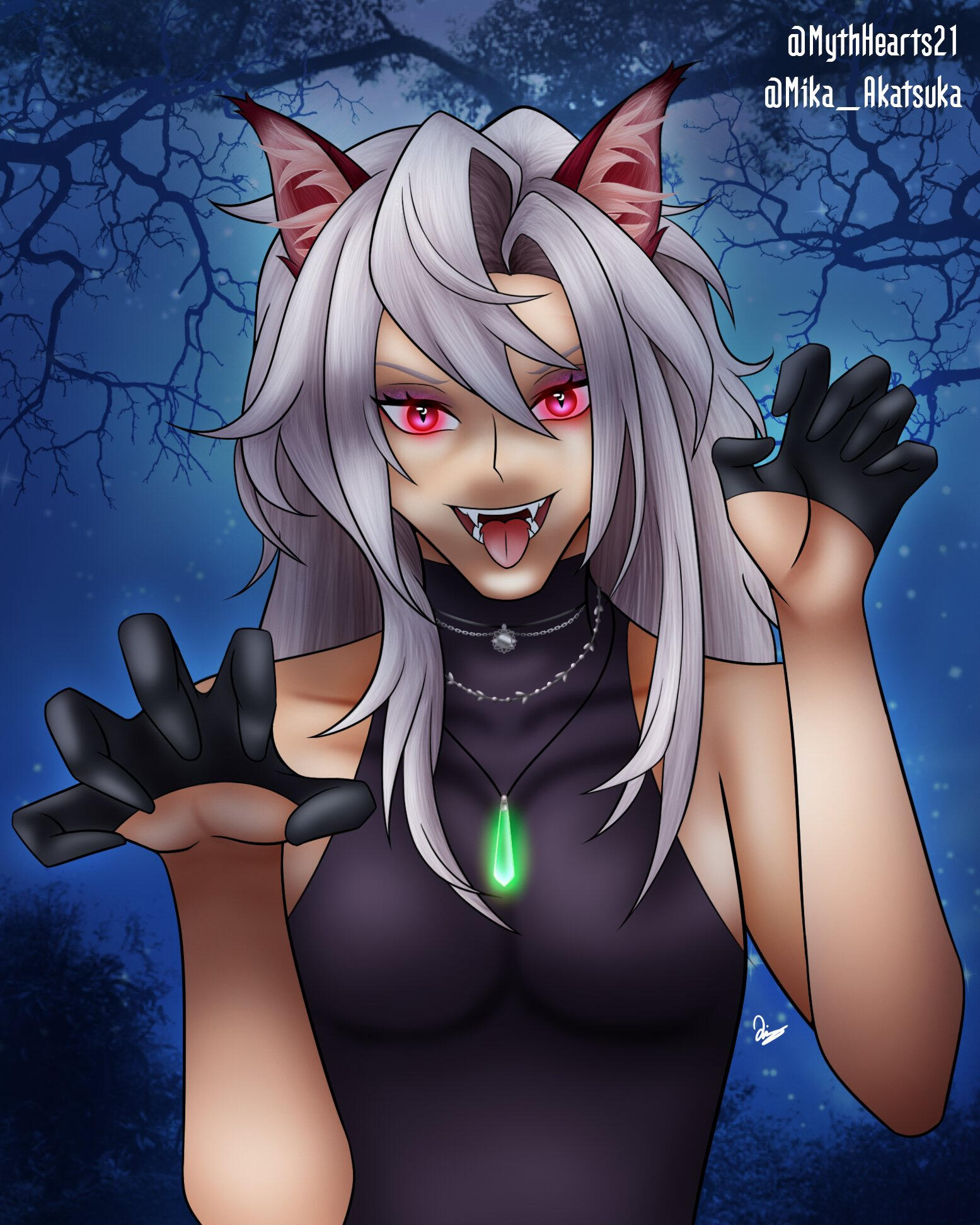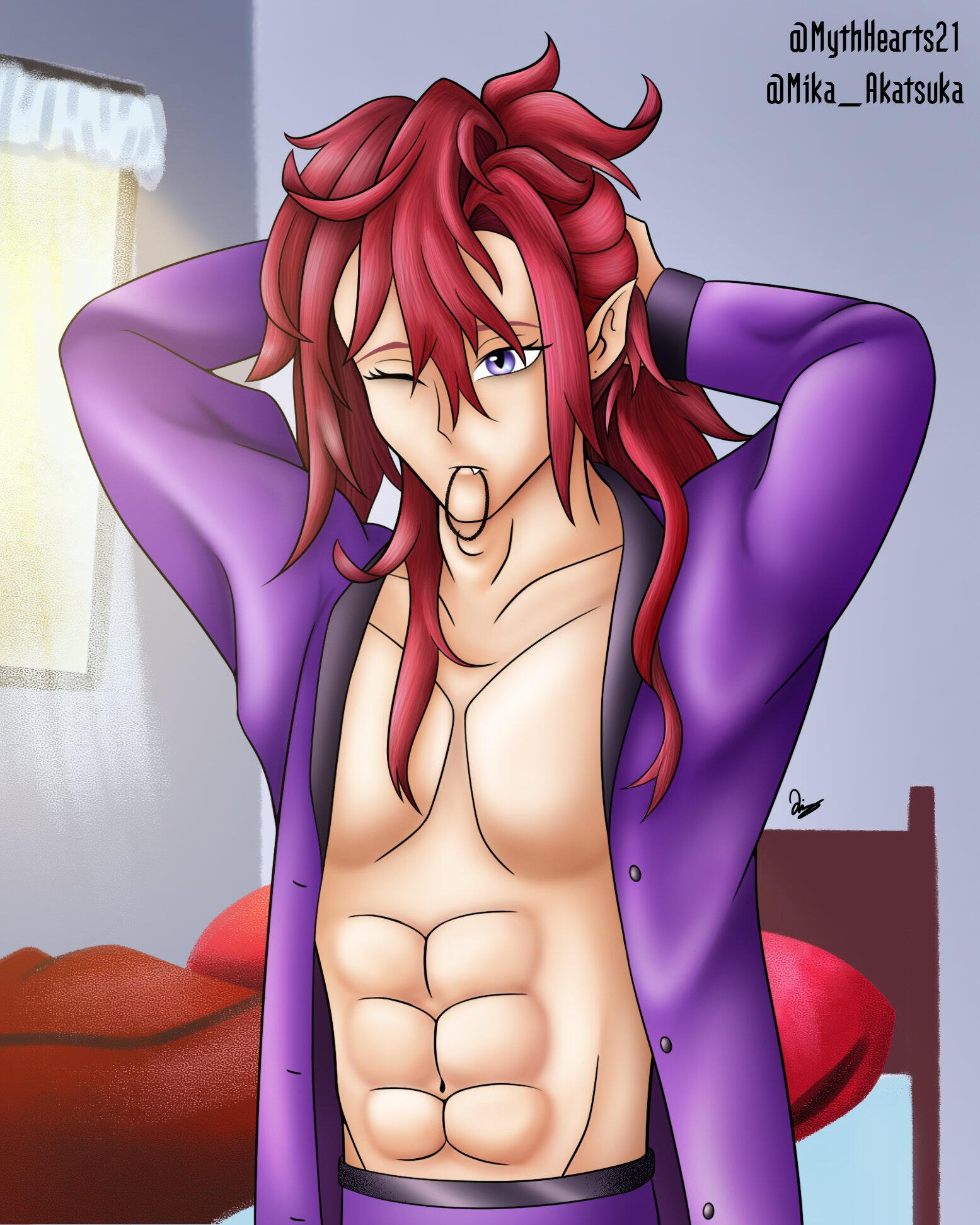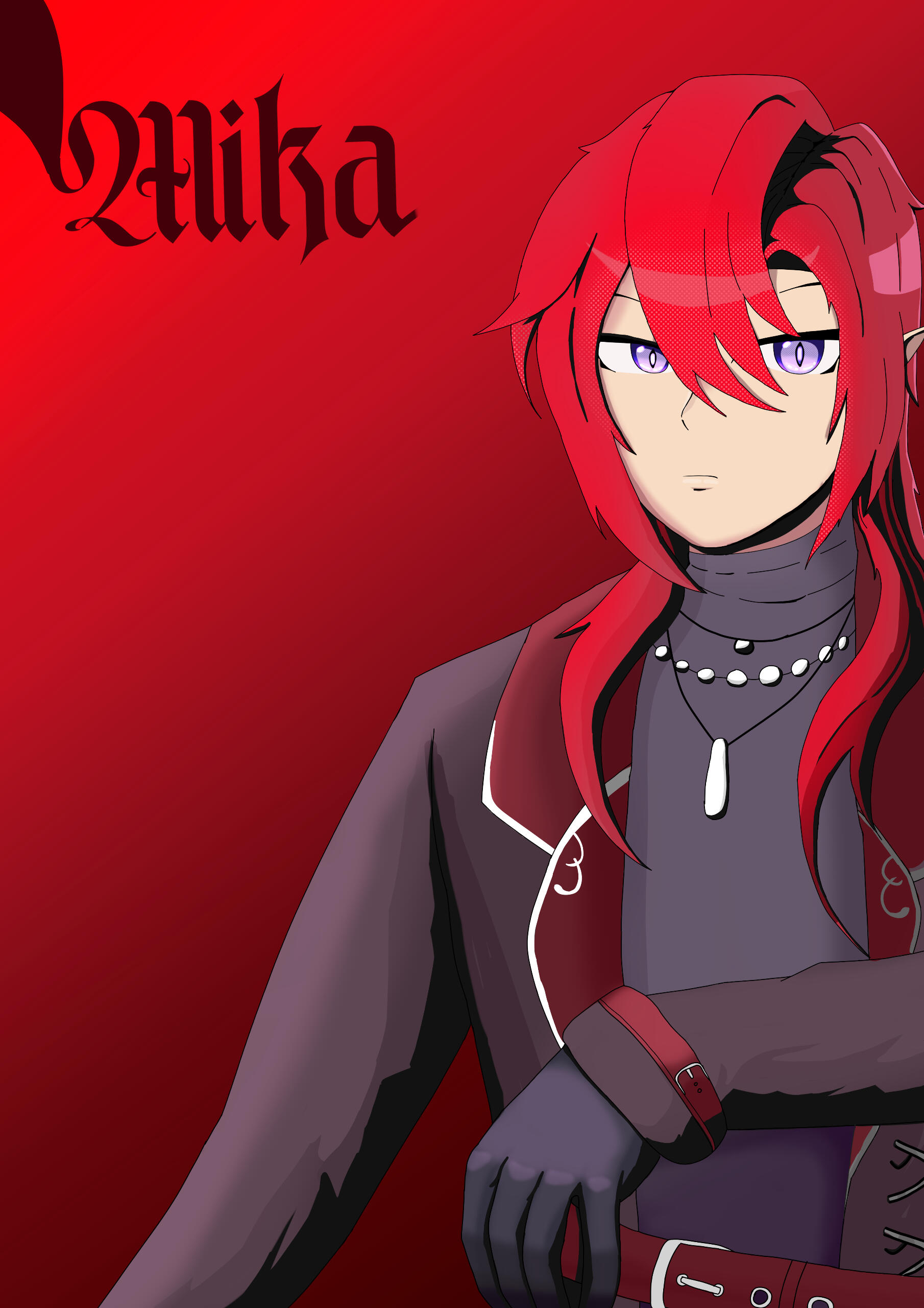 A being from another world, closely aligned to depictions of patupaiarehe however uses *vampire as a quick descriptor.In human form, Mika Akatsuka is a red-haired man with pointed ears and fangs. He has messy bangs and a long ponytail that rests over his left shoulder. He wears a sleeveless black turtle-neck muscle shirt under a soft leather jacket with patterned red fabric on the lapels and inner jacket. The jacket also features silver filigree for details. He wears black pants and thigh-high heeled boots with laces and silver details. On his hands he wears black leather half-palm gloves.Around his waist he wears a red sash with an hourglass chained to it. The hourglass is magical however it appears whatever abilities it had were lost upon arriving in this world. He also wears red belts around the outside of his jacket. At the small of his back, wrapped around the belts, is a grey gauze material.For accessories, he wears a collection of floral themed necklaces as well as a pounamu necklace, carved from greenstone with protection magic imbued into it. The shape is based on toki-adze which is a symbol of strength, determination, and courage in times of adversity. His left ear has a helix-to-lobe chain earring with a moon and star.He also has a set of jewellery involving purple gemstones. A brooch, surrounded by silver sunflower filigree which is connected to a gem on his shoulder and a hanging pendant made from a broken gemstone surrounded by more silver filigree.His clothing and makeup is inspired by visual kei.In cat form, he is akin to a large, very fluffy red Maine Forest cat at 60cm (1'9"). He still retains his pounamu in this form.