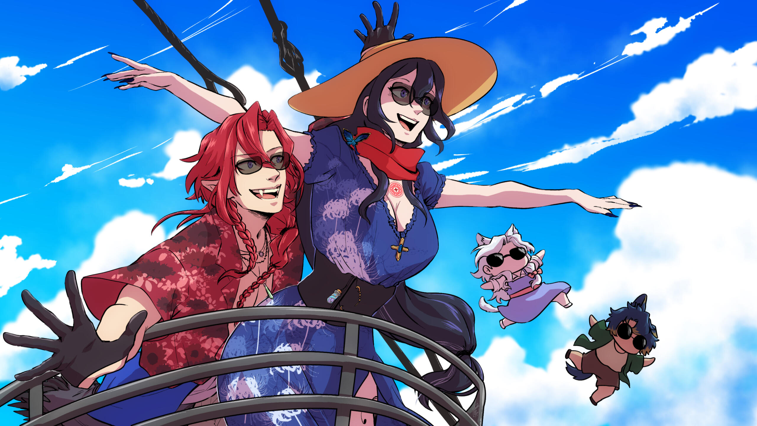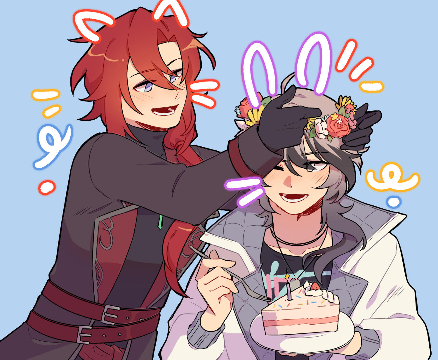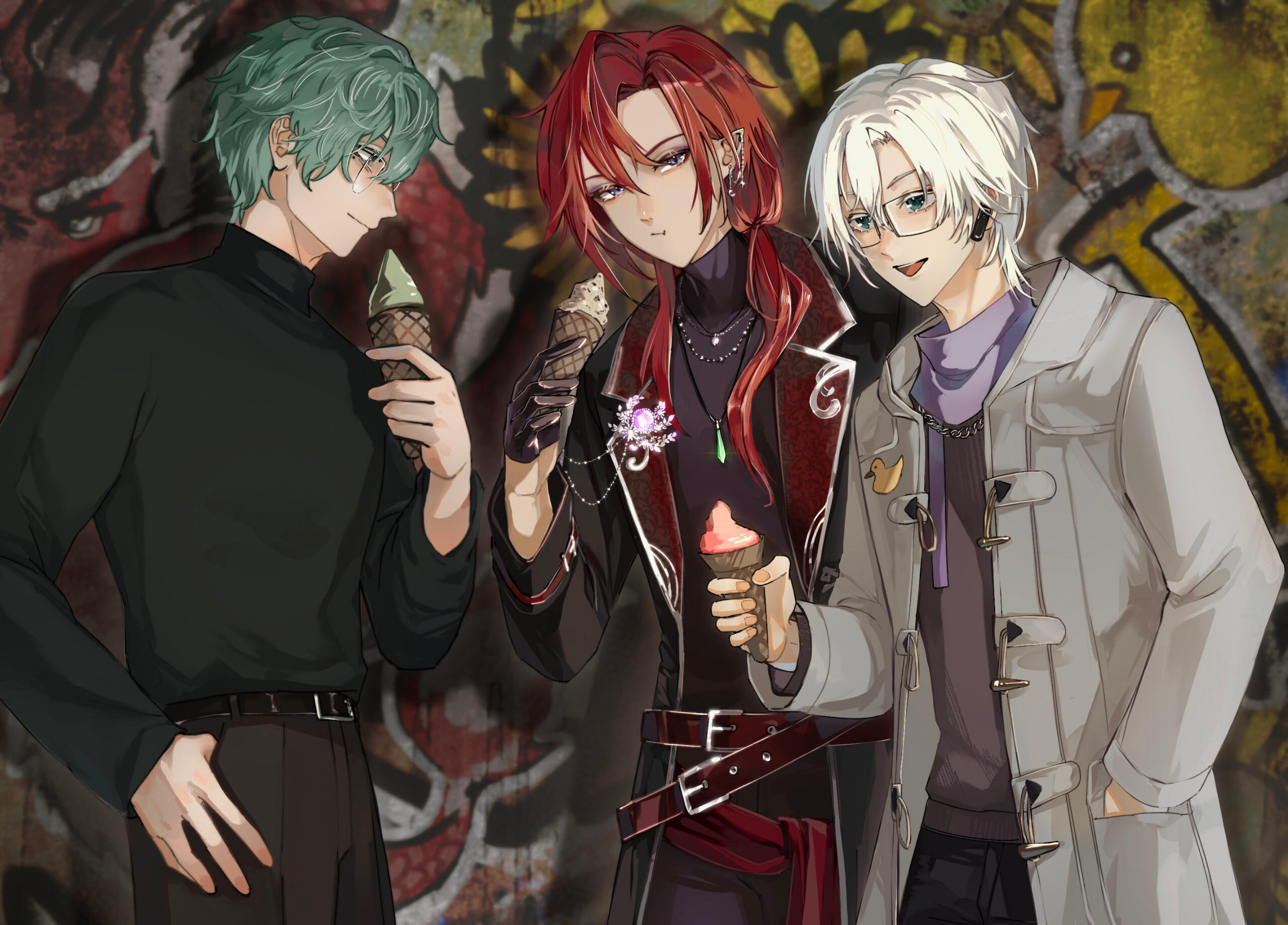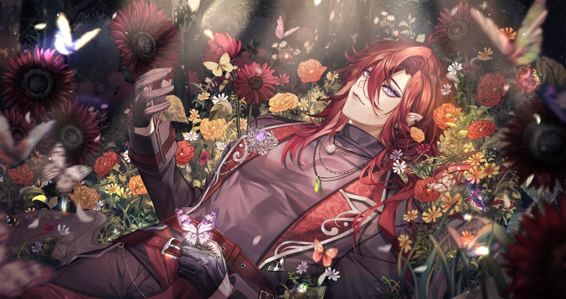 A being from another world, closely aligned to depictions of patupaiarehe however uses *vampire as a quick descriptor.In human form, Mika Akatsuka is a red-haired man with pointed ears and fangs. He has messy bangs and a long ponytail that rests over his left shoulder. He wears a sleeveless black turtle-neck muscle shirt under a soft leather jacket with patterned red fabric on the lapels and inner jacket. The jacket also features silver filigree for details. He wears black pants and thigh-high heeled boots with laces and silver details. On his hands he wears black leather half-palm gloves.Around his waist he wears a red sash with an hourglass chained to it. The hourglass is magical however it appears whatever abilities it had were lost upon arriving in this world. He also wears red belts around the outside of his jacket. At the small of his back, wrapped around the belts, is a grey gauze material.For accessories, he wears a collection of floral themed necklaces as well as a pounamu necklace, carved from greenstone with protection magic imbued into it. The shape is based on toki-adze which is a symbol of strength, determination, and courage in times of adversity. His left ear has a helix-to-lobe chain earring with a moon and star.He also has a set of jewellery involving purple gemstones. A brooch, surrounded by silver sunflower filigree which is connected to a gem on his shoulder and a hanging pendant made from a broken gemstone surrounded by more silver filigree.His clothing and makeup is inspired by visual kei.In cat form, he is akin to a large, very fluffy red Maine Forest cat at 60cm (1'9"). He still retains his pounamu in this form.