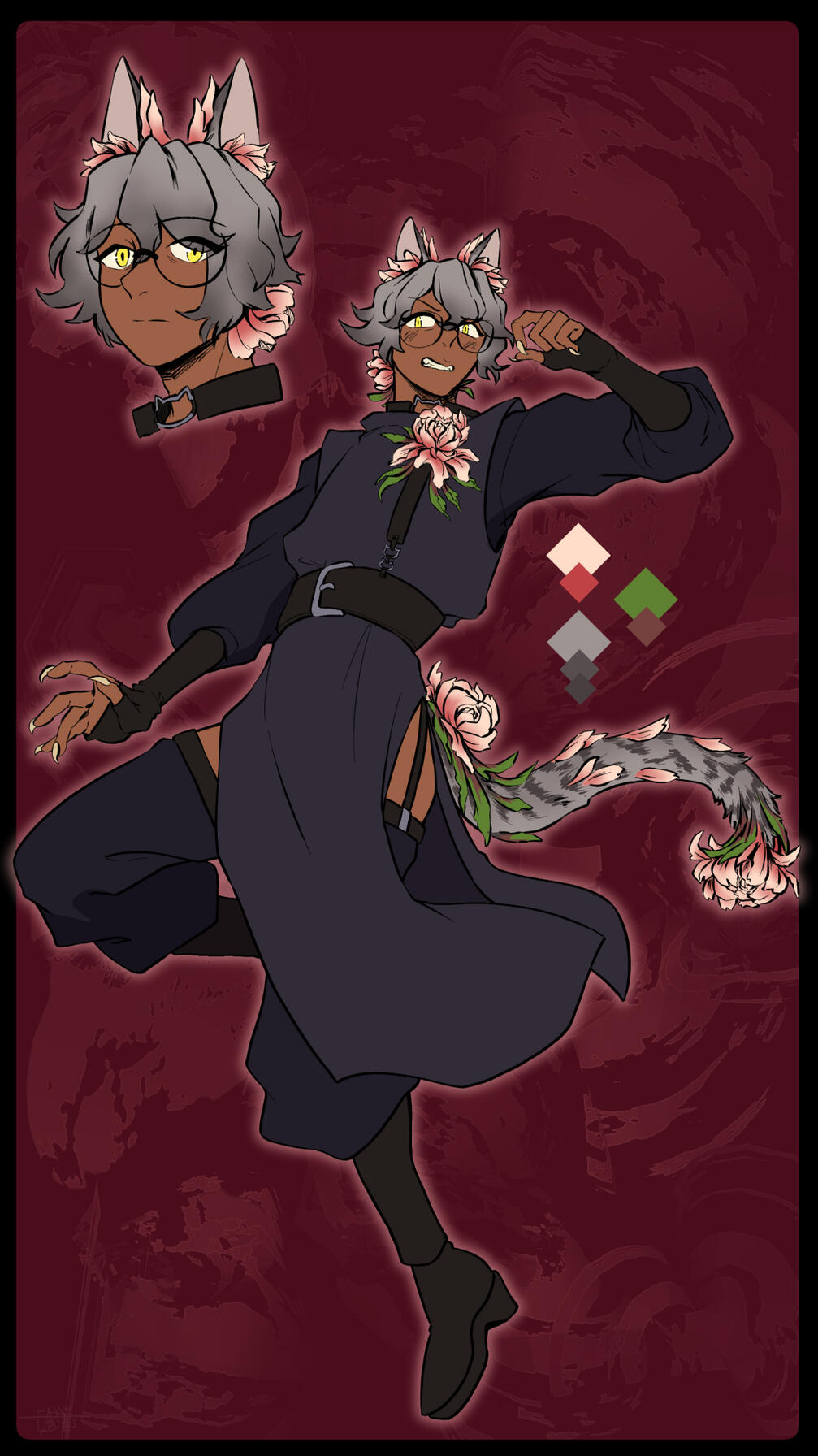 Human-form Mikats, like cat-form Mikats, come in all shapes and sizes. Their main difference is that they are humanoid overall with a cat tail and ears as the base of their design.Flowers bloom on the feline parts of their bodies, but can be found elsewhere on the body as well.In this example above, Koa is an Egpytian Mau with peony flowers.Art by AmagRenVT