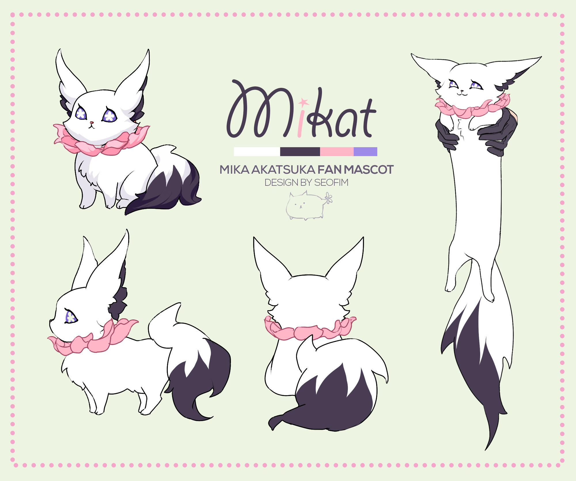 Cat-form Mikats come in all shapes and sizes and reflect various breeds of cat.Their key attributes are their large eyes with flower-shaped pupils and large ears. Their coats can vary in type and colour, though will generally follow a similar silhouette. When sitting or standing, their body appears compact, but upon being picked up, they are revealed to be long creatures.Flowers grow around areas of their bodies such as neck, tail and ears. Flower types vary, but are always present.Art by seofim