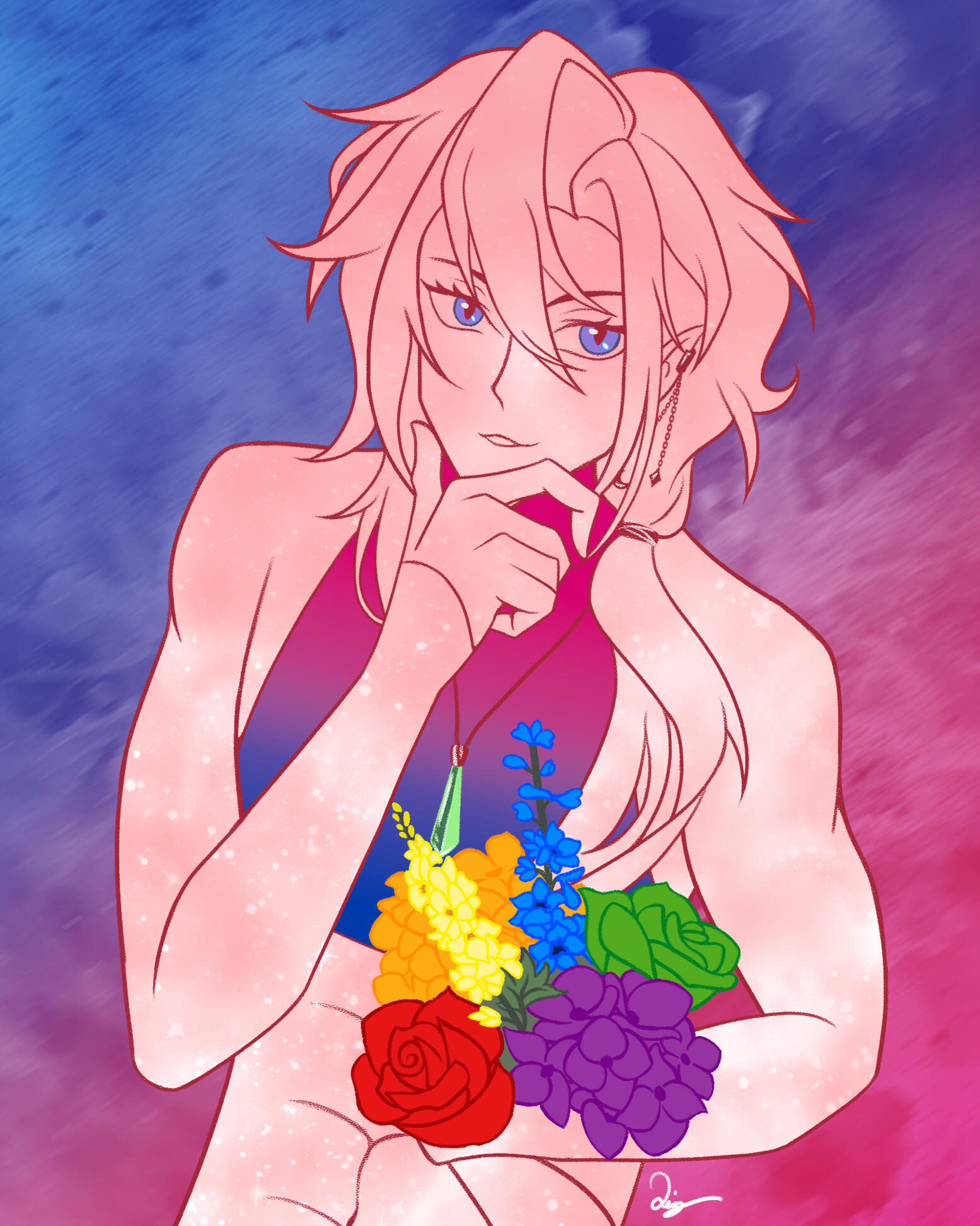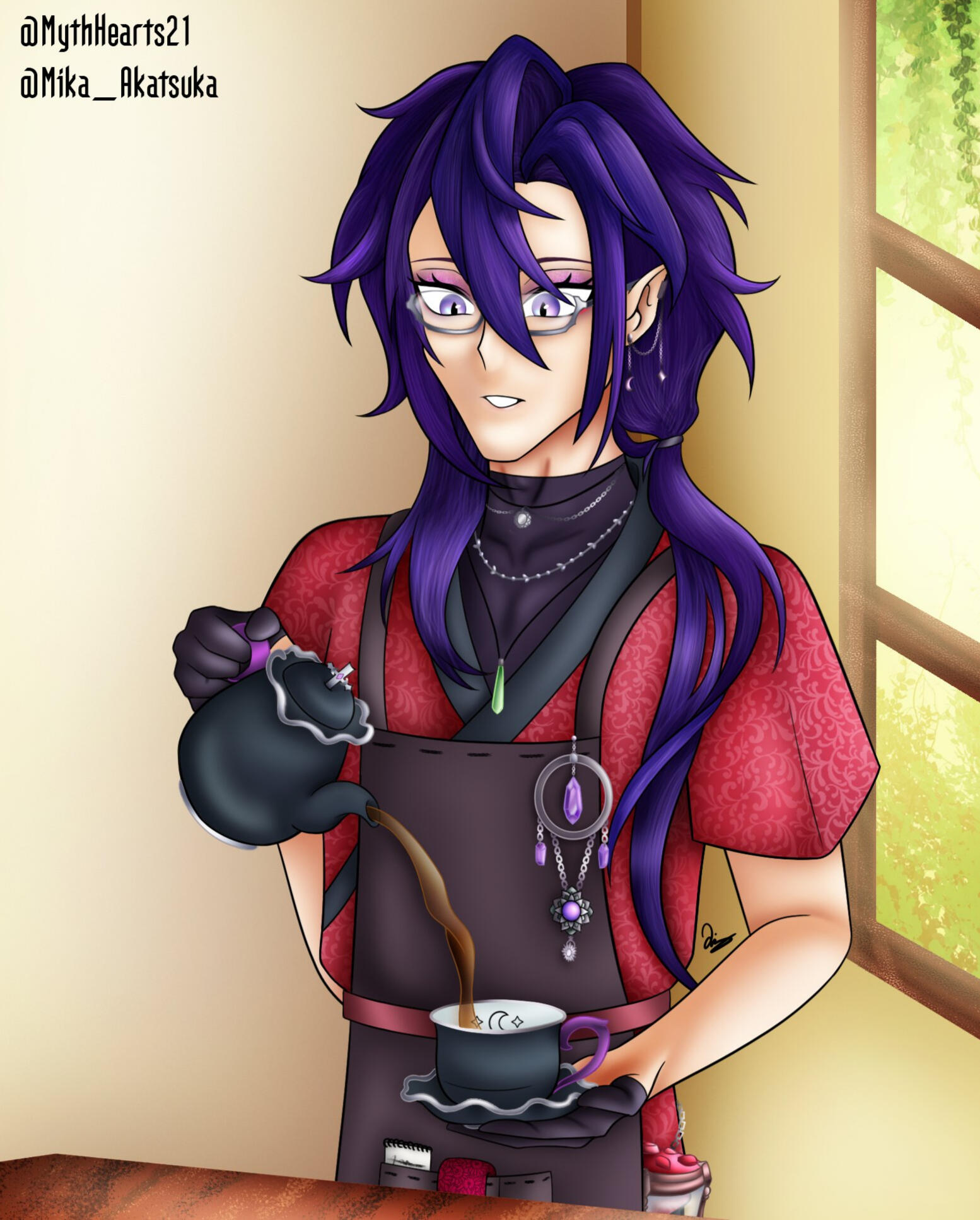 Mika lived on Earth for many years with a family that treated him as their adopted son. He eventually moved away and established Nightfall's Bloom. Originally meant to just be a florist, he found that many would come back to spend their time in the comfortable environment. He upgraded the shop to include tables and comfortable places to relax, as well as an area to purchase delicious cakes and other desserts.Over time, he would learn what streaming is and become a VTuber, opening the shop to any fans who wish to seek a place to have fun and watch his stream shenanigans.He is still not over the incidents of his past, and the clothes he wears are a mix of his own, and attire from his deceased partner. Maybe one day he'll learn how to let go and allow himself to move on...?