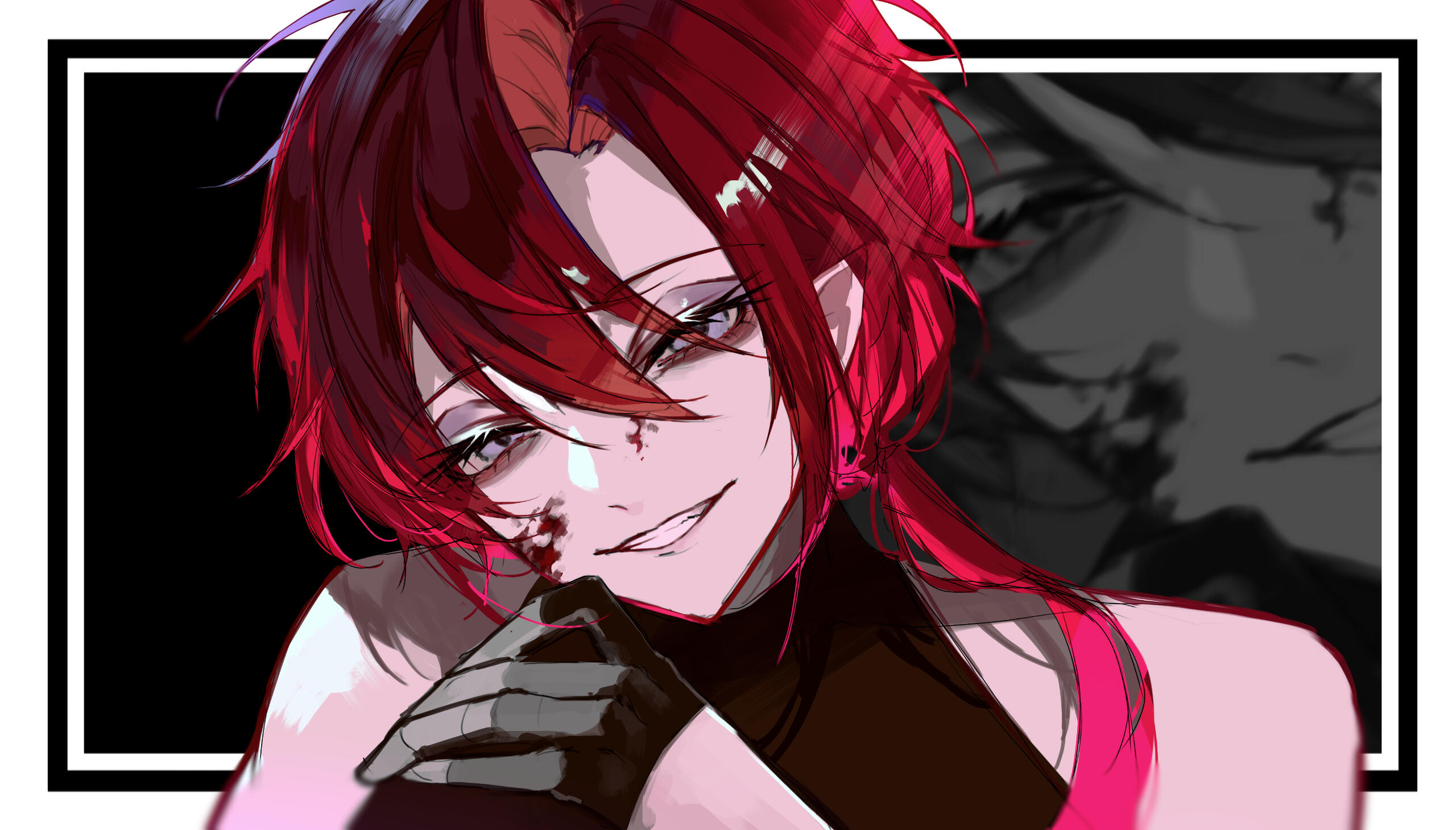 BUILD Lean and muscular HAIR Scarlet hair with messy bangs and a ponytail